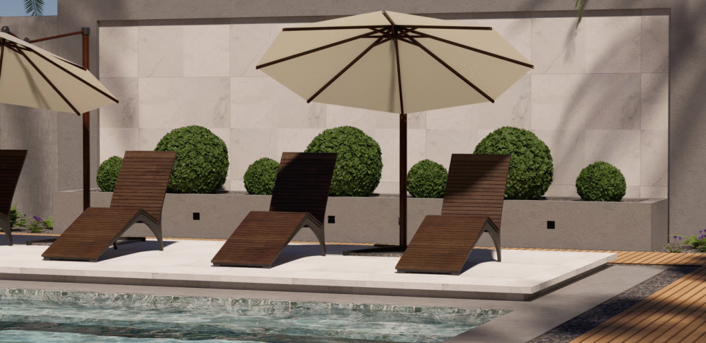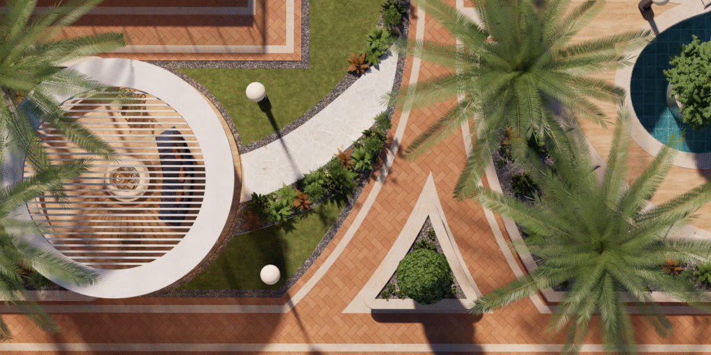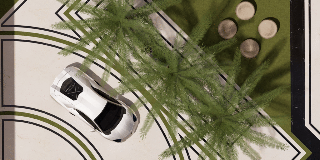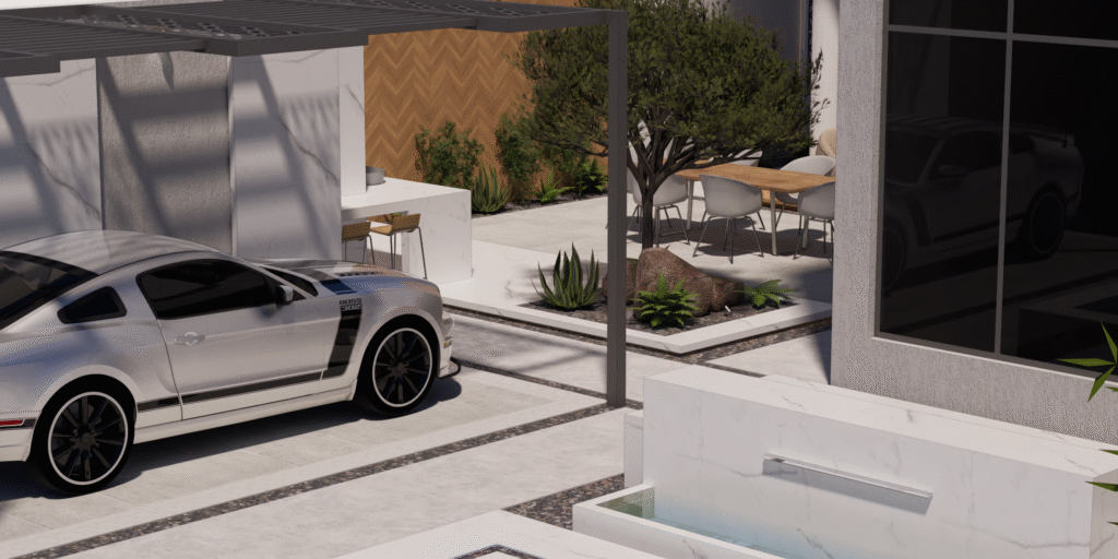 يهدف المشروع إلى تصميم فناء خارجي حديث لفيلا خاصة، حيث طلب العميل دمج مسبح وموقف سيارة ضمن مساحة محدودة، مع تنسيق أعمال الزراعة لإضفاء طابع طبيعي وجمالي على المكان. يركز التصميم على استغلال المساحة بذكاء وتوفير جميع العناصر المطلوبة بأسلوب أنيق ومتناسق
