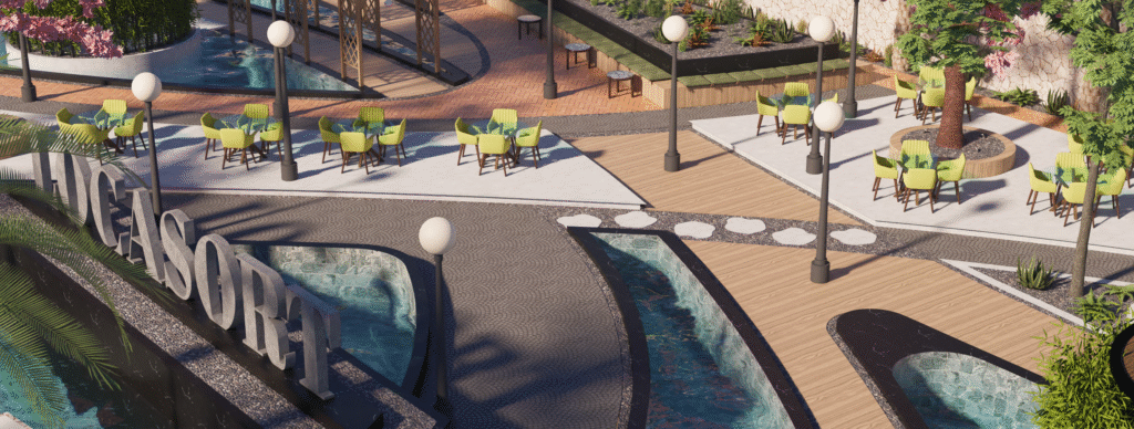 تصميم منتجع لوكازورت بدأ بعد طلب ادارة المنتجع استشارة من فريق الباكتو حول المكان طلبا لإضافة أفكار إبداعية للموقع ، اقترحنا تصميم جديد كليا بطابع عصري وأكثر رفاهية، تم البدء بالرفع المساحي وتحديد الممرات الرئيسية والفرعية وتوزيع الإنارة وإضافة بحيرة صناعية بوسطها جلسات خاصة تناسب بيئتنا لإضافة شعور الاسترخاء و الخصوصية للزوار، بالإضافة إلى توزيع الجلسات المفتوحة والتشجير للتمتع بجودة الحياة مع إطلالة جمالية مختلفة لكل جلسة ،وتمكنا من خلال التصميم رفع الطاقة الاستيعابية واستغلال جميع المساحات مما يعود بالنفع والفائدة لإدارة المنتجع وخلق تجربة جديدة ومميزة لزوار لوكازورت .