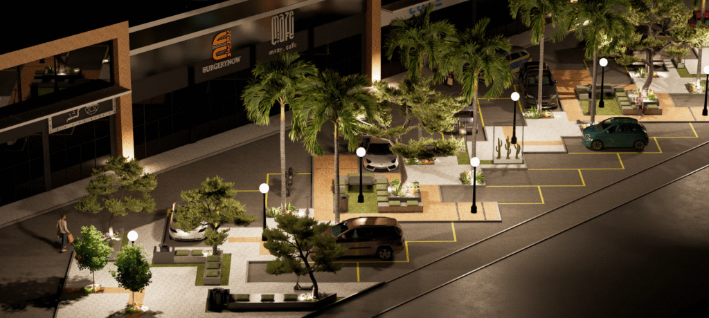 مواقف سيارات ورصيف تقليدي لمجمع مطاعم وكافيهات كانت احدى مشاكل لمجمع مطاعم وقهاوي بالدمام وبعد التواصل مع فريق الباكتو و زيارتنا للموقع تخيلنا تصميم مبتكر واكثر جاذبية ، تحسن من تجربة الزوار، بدأنا بالتصميم بعد اخذ الرفع المساحي وتحديد المداخل والمخارج بطريقة مدروسة مع زيادة عدد المواقف ، وتم التركيز على الرصيف بوضع الممرات والتشجير وتوزيع الانارة وجلســــات تخدم المحـــــلات ، ممــــا يساعد في زيادة الاقبال على المجمع و استمتاع الزوار بالأجواء الخارجية .